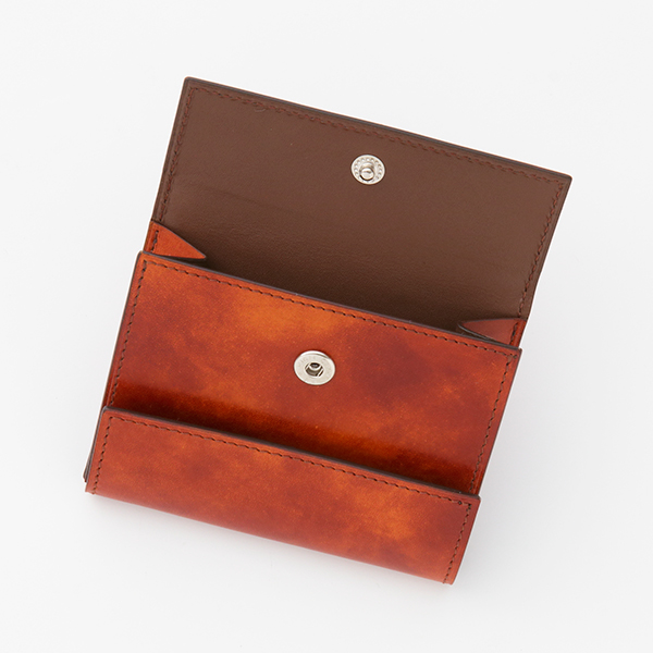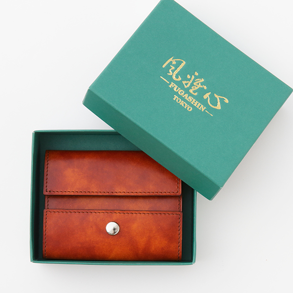 「風雅心」の財布、革小物はカットエッジ製法でお造りしました。カットエッジ製法とは、デザインに合わせ型抜きされた二枚の革を接着し縫い合わせる製法で、縫製断面を丹念に磨き染料着色された、コバ(革断面)に特徴があります。「風雅心」の仕上げ職人の熟練の技をそれぞれの製品でお確かめください。使い込み、年を重ねるごとに、趣と風合いを深める厳選したヨーロッパ産のユーロカーフの味わいと合わせ、お楽しみください。