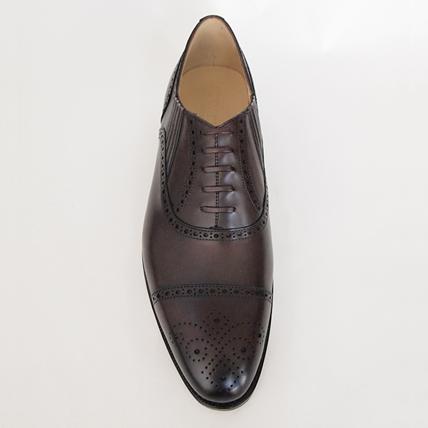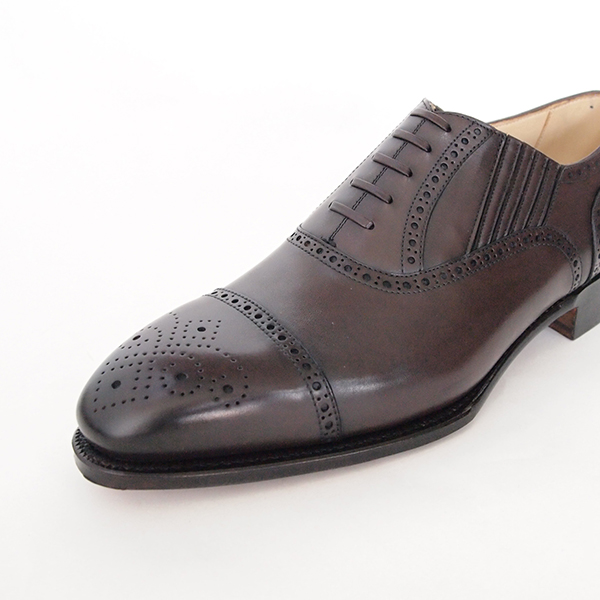パンチドキャップトウにメダリオンの穴飾り、フェイクシューレースをあしらったサイドエラスティックのデザインは内羽根スタイルに似て、おしゃれで着脱の容易な実用性を兼ね備えた靴です。