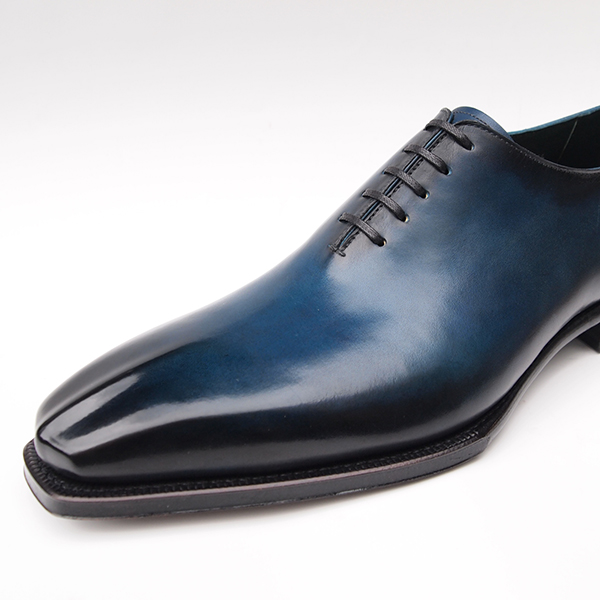 ホールカットまたはワンピースとも呼ばれる大変贅沢なデザイン。一枚の皮革から数足分しか取れない一枚甲で縫い上げます。本製品では仕上げを熟練の技が必要とされる特殊なアンティーク仕上げ法、パティーヌ仕上げを採用し、最高級靴にお仕立てしました。一足ずつ手仕上げですので、微妙な違いの良さがあり、貴方様だけの世界に一足の靴です。