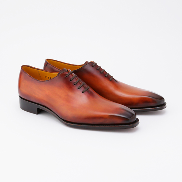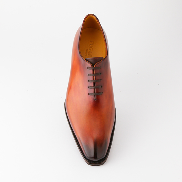 ホールカットまたはワンピースとも呼ばれる大変贅沢なデザイン。一枚の皮革から数足分しか取れない一枚甲で縫い上げます。本製品では仕上げを熟練の技が必要とされる特殊なアンティーク仕上げ法、パティーヌ仕上げを採用し、最高級靴にお仕立てしました。一足ずつ手仕上げですので、微妙な違いの良さがあり、貴方様だけの世界に一足の靴です。